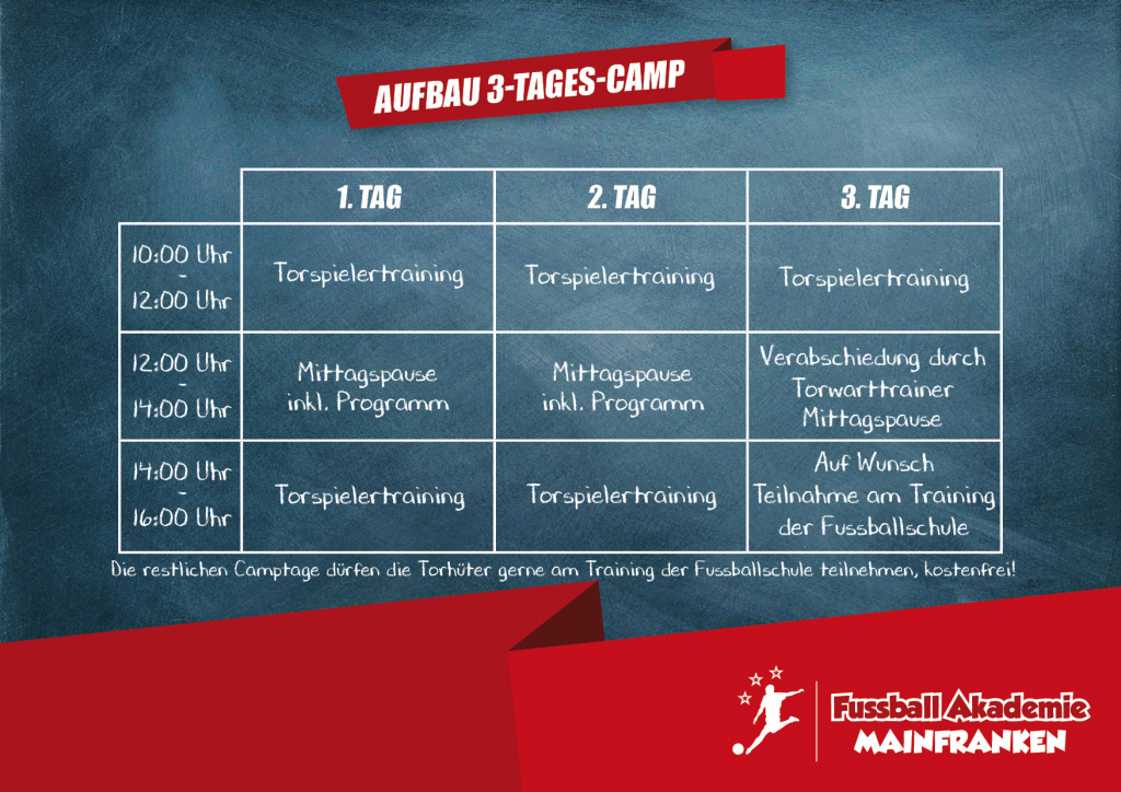 Anmeldung SG W.IN.D Fussball-Camp | Sommerferien 3 Tage Mo. 07.09.2026 – Mi. 09.09.2026 Sportgelände SV Insingen:An der ehemaligen B25 | 91610 Insingen zurück zur Übersicht Paket-Beispiel Inklusive Rucksackbeutel Pokal & Urkunde Fussballbasiertes Freizeitprogramm Sportgerechte Getränke Tägliche Betreuung ab 9 Uhr Warme Mahlzeit zwischen den Trainingseinheiten Camp-Ablauf Partnerverein Camp-Ablauf Änderungen vorbehalten. Partnerverein Bitte aktiviere JavaScript in deinem Browser, um dieses Formular fertigzustellen.Bitte aktiviere JavaScript in deinem Browser, um dieses Formular fertigzustellen.Geschlecht *JungeMädchenBitte auswählenName *VornameNachnameVereinDer Teilnehmer spielt in folgendem VereinGeburtsdatum *Bitte auswählenAusstattung/Pakete/Preise *Paket 1: Trikot, Hose, Stutzen, Ball + Camp - 195,00 €Paket 2: Trikot, Hose, Stutzen + Camp - 185,00 €Paket 3: Trikot + Camp - 175,00 €Paket 4: Trikot + Ball + Camp - 185,00 €Wähle das gewünschte AusstattungspaketKonfektionsgröße *S 122-128M 134-140L 146-152XL 158-164NEU! Trikot Beschriftung (optional buchbar)Brust: Name Klein (4,95 EUR)Du kannst die einzelnen Möglichkeiten auch gerne kombinierenTrikotname (falls zugebucht)Gebe hier an, welcher Name auf Dein Trikot gedruckt werden sollMedikamente, BesonderheitenGibt es Medikamente, die der Teilnehmer benötigt oder Besonderheiten, die wir kennen sollten?Rechnungsempfänger *VornameNachnameStraße + Haus-Nr. *Straße + Haus-Nr. des RechnungsempfängersPLZ + Ort *PLZ + Ort des RechnungsempfängersTelefon 1 *Festnetz / MobilTelefon 2Festnetz / MobilE-Mail-Adresse *AGB & DatenschutzIch habe die AGB's der Fussball Akademie Mainfranken gelesen und bin damit einverstanden.Ich habe die Informationen zum Thema Datenschutz gelesen und bin damit einverstanden.kostenpflichtig buchen *mit dem Klick auf den Button erklären Sie sich mit den AGBs und den Datenschutzbestimmungen der Fussball Akademie Mainfranken einverstanden.